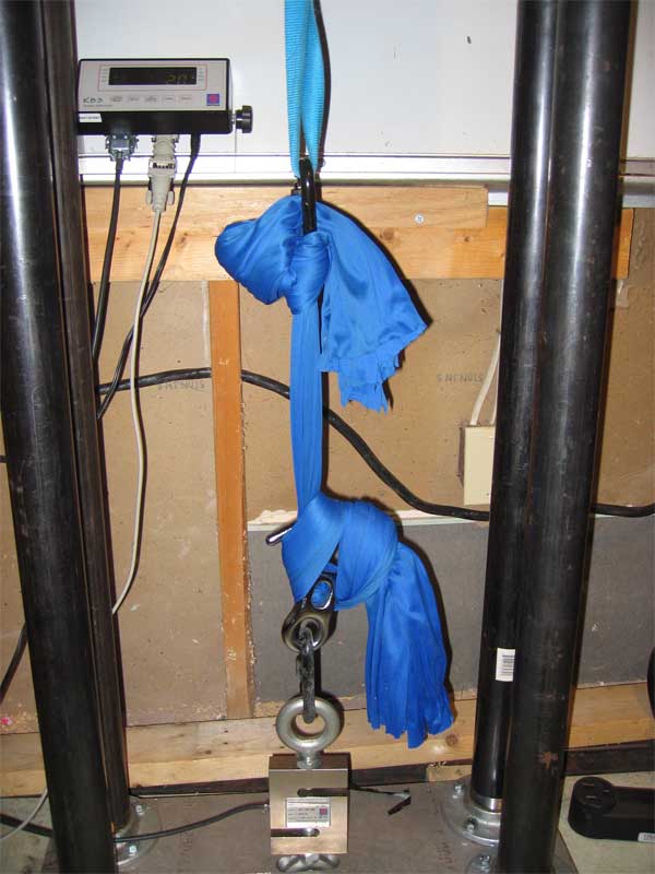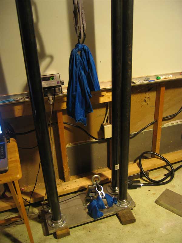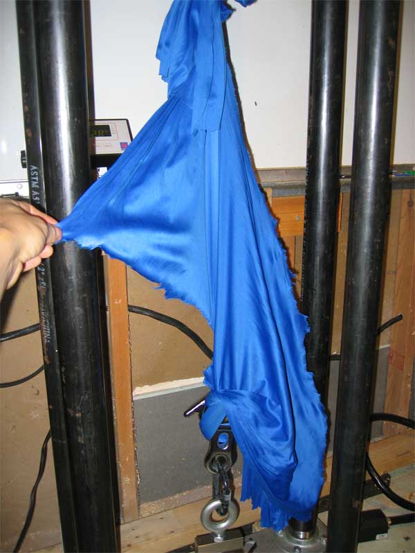 a home-brew tensile stress tester. 8-foot sections of the fabric bolt were