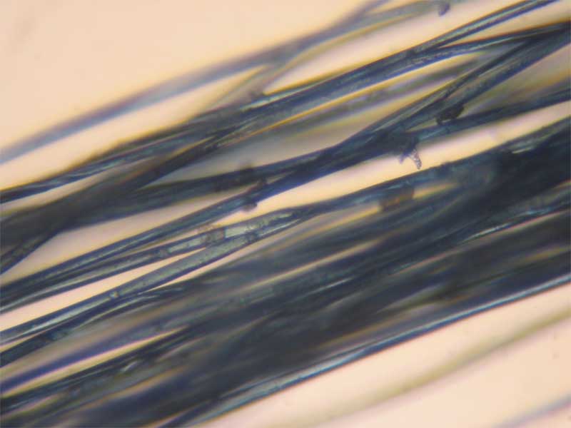 Under the microscope there seemed to be only one type of fiber. Microscope photo of fabric. The yarn is a spun
